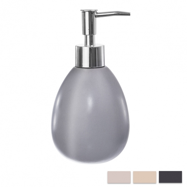 Dávkovač mýdla/saponátu s pumpičkou. Materiál: dolomit (druh keramiky), plast. Assort barev. Rozměry: objem 0,38 l, pr. 8,5 cm, v. 16,5 cm.