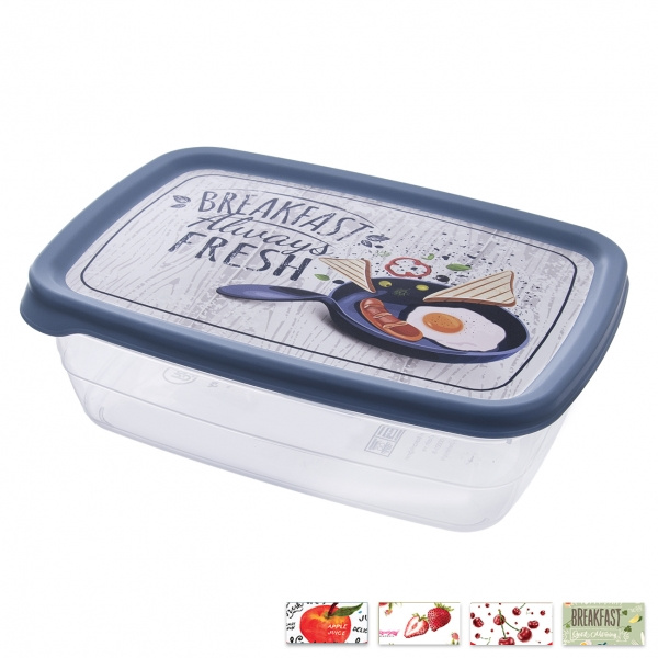 Dóza s víčkem obdélníková. Uchová potraviny. Hodí se i na uskladnění drobností - korálky, knoflíky, potřeby pro kutily... Materiál: plast. Použití od - 10 °C do + 95 °C. Barevný assort víček. Rozměry: objem 1,2 l, 20x14x6,5 cm.