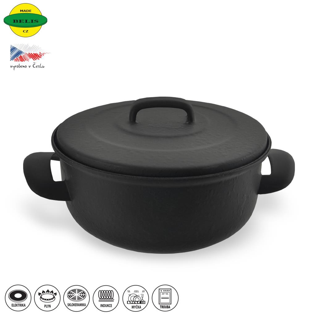 Hrnec se smaltovým povrchem a s poklicí - můžete použít jen minimální množství tuku při přípravě pokrmů. Materiál: 2mm plech se smaltovou povrchovou úpravou - nazýváno jako česká litina. Výborně vede teplo - nabízí ekonomické vaření. Vhodný na všechny typy tepelných spotřebičů včetně indukce, do trouby. Při manipulaci doporučujeme použít kuchyňské chňapky. Rozměry: objem 3,5 l, pr. 20 cm, v. 12 cm. Nádobí je vhodné do myčky na nádobí, ale je potřeba po umytí dobře osušit a uchovat v suchu.    Vaření na smaltu je tím nejzdravějším možným způsobem přípravy pokrmů. Toto nádobí má navíc uvnitř nádob aplikován speciální modrý smalt, který má výborné kyselinovzdorné vlastnosti a zůstává po celá léta prakticky netknutý běžným používáním.  Každý hrnec či pánev z této řady nádobí je originálem. Z vnějšku nádob je totiž ručně nanesena plasticita, která tento produkt dělá naprosto unikátním. Po každé aplikované vrstvě smaltu je nádobí vypáleno v peci o teplotě přibližně 850 °C. Tento způsob aplikace povrchu zajišťuje, že se Vám smalt rozhodně nesloupne po pár použitích jako je tomu například u různých keramickým či teflonových, které jsou nám masivně servírovány z médií všude kolem nás. Pro toto nádobí je charakteristický černý matný smalt vně nádob. Tento smalt je zprvu otevřený, a tak jsou na něm viditelnější stopy po otěru. Stopy se dají samozřejmě pohodlně umýt. Tento matný smalt se však po pár použitích a umytích zatáhne a získá klasickou, tmavě černou barvu.