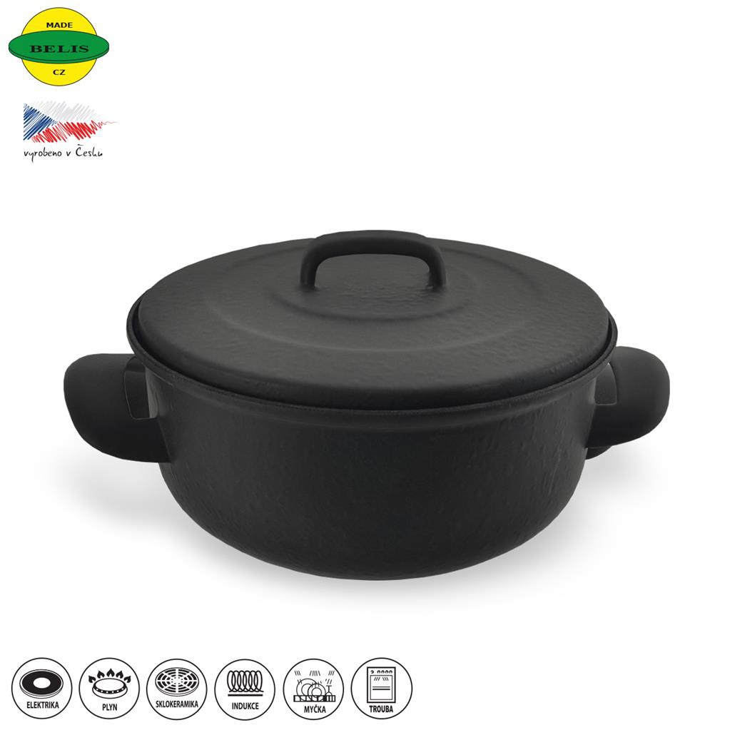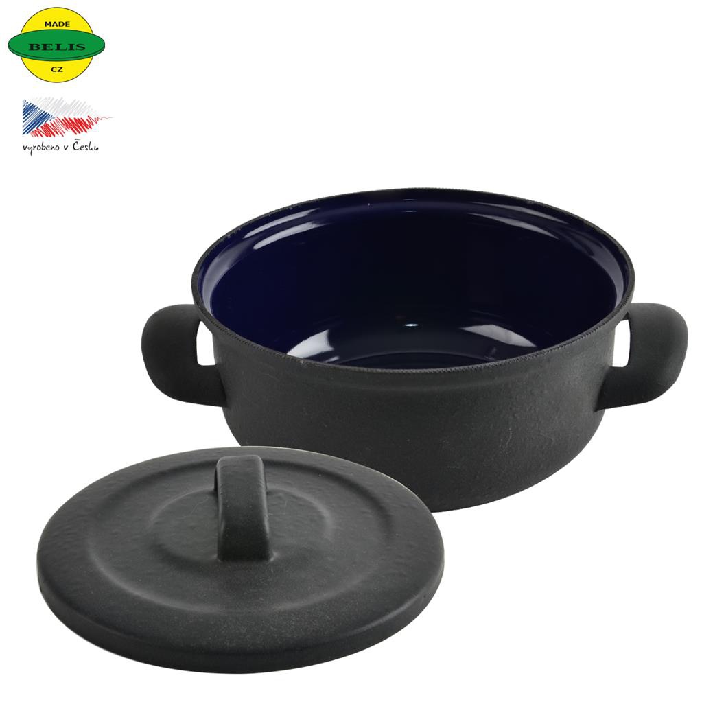 Kastrol se smaltovým povrchem a s poklicí - můžete použít jen minimální množství tuku při přípravě pokrmů. Materiál: 2mm plech se smaltovou povrchovou úpravou - nazýváno jako česká litina. Výborně vede teplo - nabízí ekonomické vaření. Vhodný na všechny typy tepelných spotřebičů včetně indukce, do trouby. Při manipulaci doporučujeme použít kuchyňské chňapky. Rozměry: objem 2 l, pr. 20 cm, v. 9 cm. Nádobí je vhodné do myčky na nádobí, ale je potřeba po umytí dobře osušit a uchovat v suchu. Vaření na smaltu je tím nejzdravějším možným způsobem přípravy pokrmů. Toto nádobí má navíc uvnitř nádob aplikován speciální modrý smalt, který má výborné kyselinovzdorné vlastnosti a zůstává po celá léta prakticky netknutý běžným používáním. Každý hrnec či pánev z této řady nádobí je originálem. Z vnějšku nádob je totiž ručně nanesena plasticita, která tento produkt dělá naprosto unikátním. Po každé aplikované vrstvě smaltu je nádobí vypáleno v peci o teplotě přibližně 850 °C. Tento způsob aplikace povrchu zajišťuje, že se Vám smalt rozhodně nesloupne po pár použitích jako je tomu například u různých keramickým či teflonových, které jsou nám masivně servírovány z médií všude kolem nás. Pro toto nádobí je charakteristický černý matný smalt vně nádob. Tento smalt je zprvu otevřený, a tak jsou na něm viditelnější stopy po otěru. Stopy se dají samozřejmě pohodlně umýt. Tento matný smalt se však po pár použitích a umytích zatáhne a získá klasickou, tmavě černou barvu.