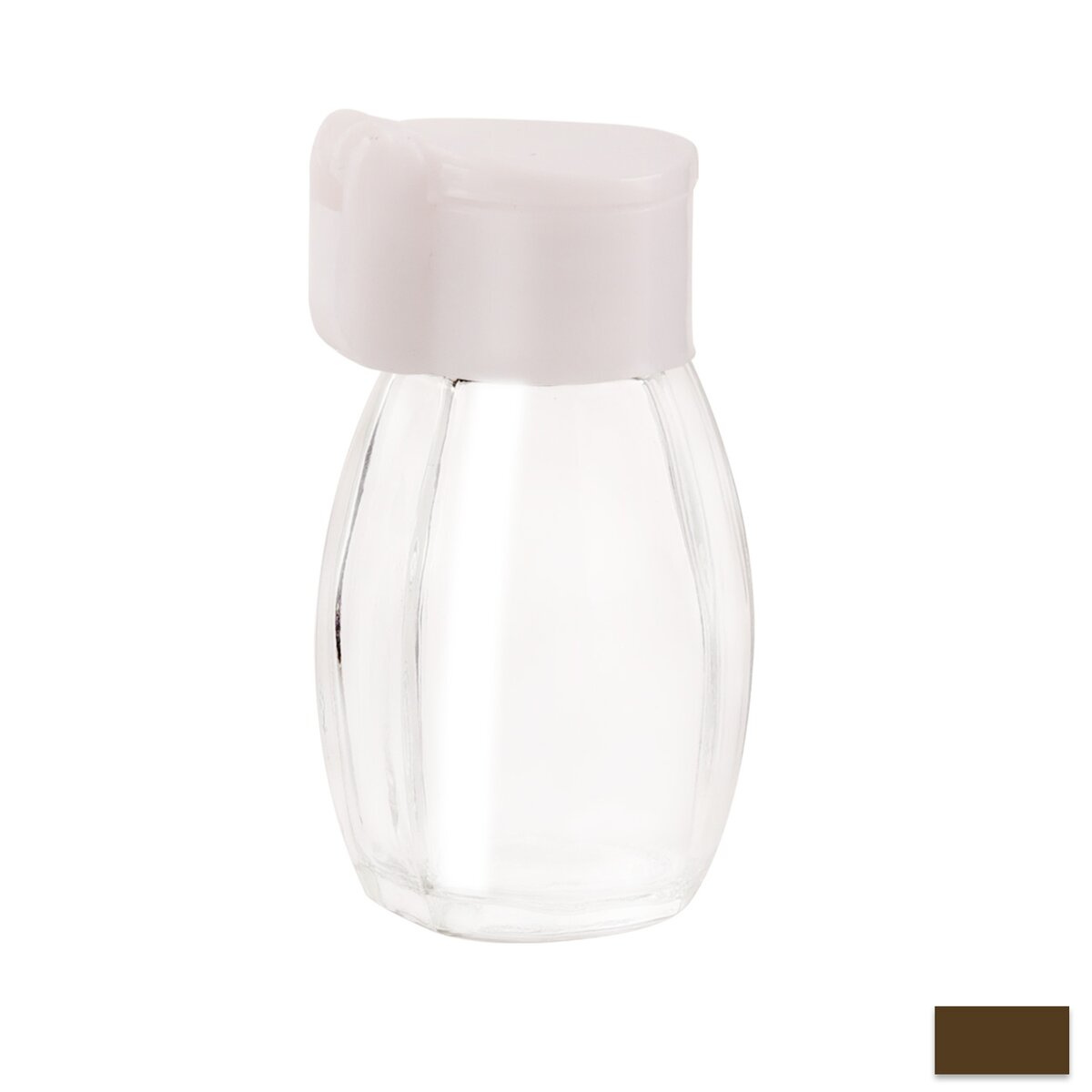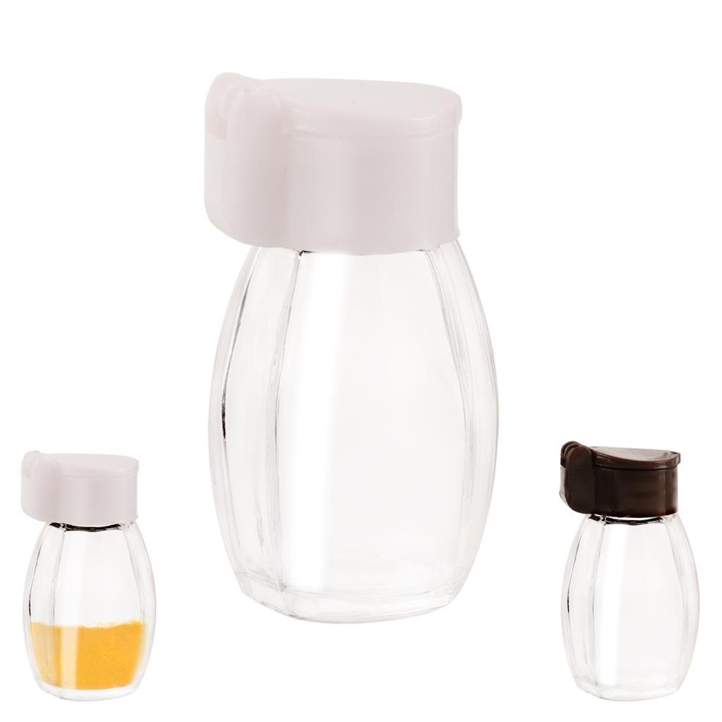 Solnička s víčkem na závit. Materiál: sklo, plast. Assort barev plastových víček. Rozměry: objem 0,05 l, pr. 4 cm, v. 7,5 cm.