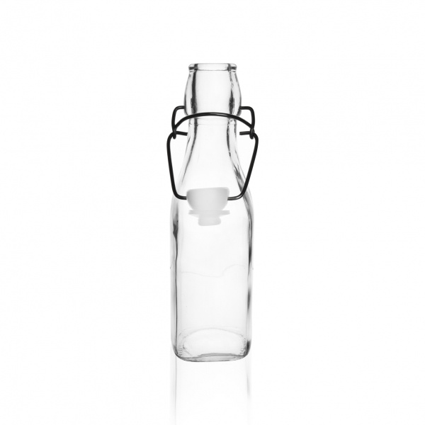 Láhev s klipem. Vhodná pro uchovávání domácí slivovice, likérů, sirupů... nebo naplněná jako dárek přátelům. Materiál: sklo, plast, kov, silikonové těsnění. Rozměry: objem 0,29 l, 5x5x20 cm. Do myčky vhodné pouze sklo. Častým používáním myčky může docházet k šednutí skla.