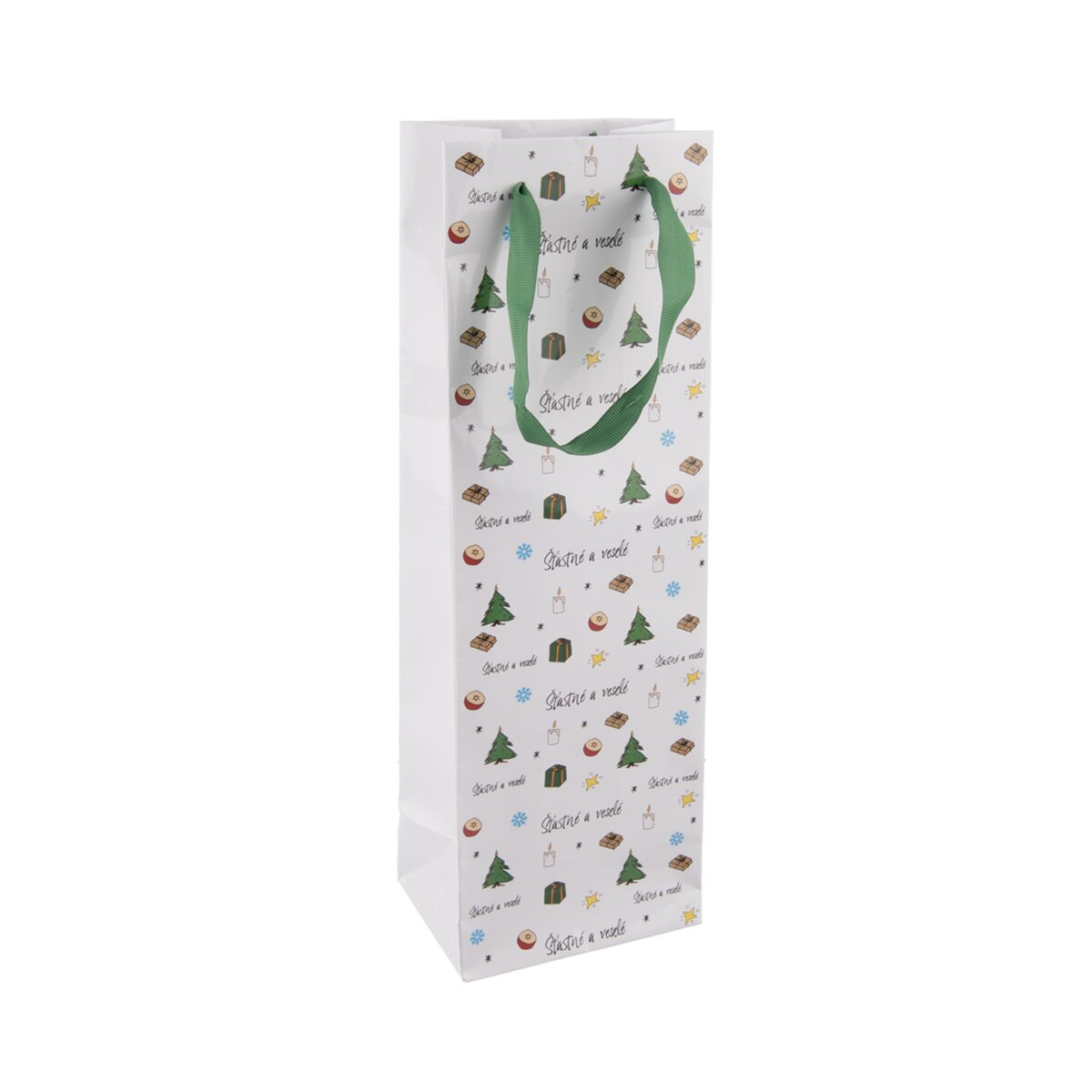 Dárková papírová taška s motivem Šťastné a veselé. Originál dekor Orion. Materiál: papír, polyester (provázek). Rozměry: 12x8,5x36 cm.