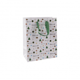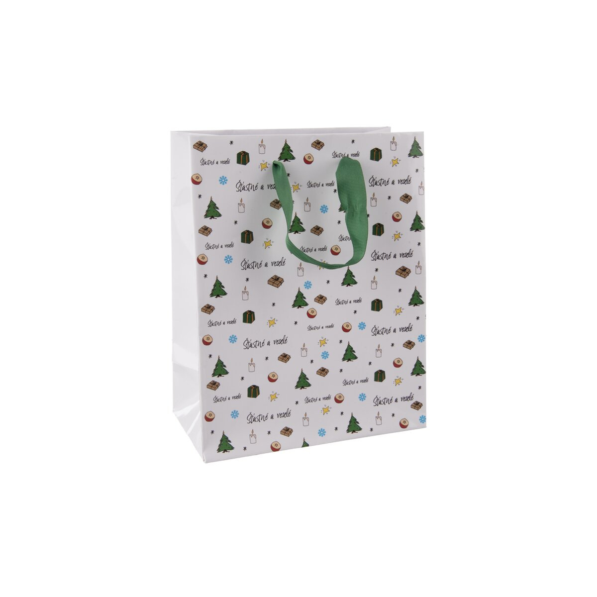 Dárková papírová taška s motivem Šťastné a veselé. Originál dekor Orion. Materiál: papír, polyester (provázek). Rozměry: 18x10x23 cm.