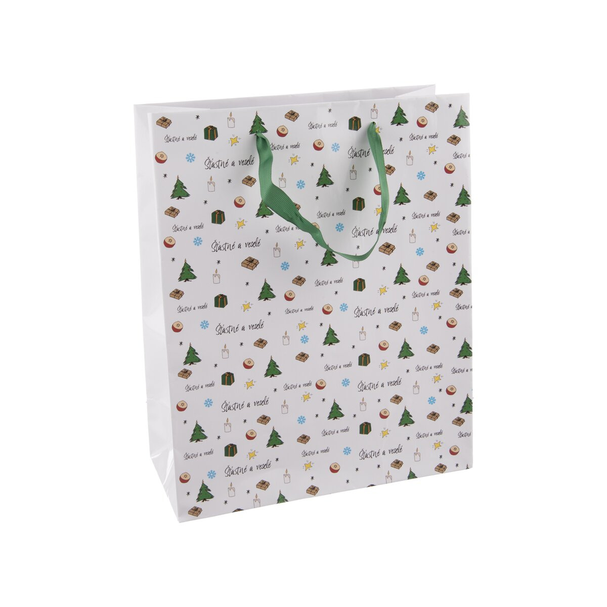 Dárková papírová taška s motivem Šťastné a veselé. Originál dekor Orion. Materiál: papír, polyester (provázek). Rozměry: 26x12x32 cm.