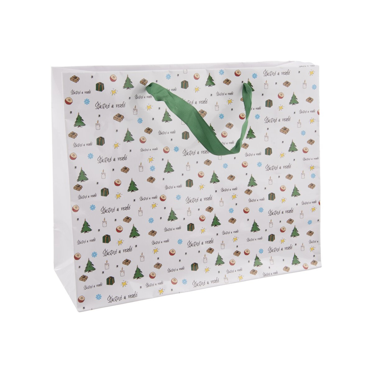 Dárková papírová taška s motivem Šťastné a veselé. Originál dekor Orion. Materiál: papír, polyester (provázek). Rozměry: 32x12x26 cm.