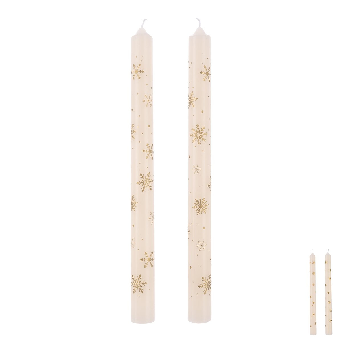 Dekorativní jednoduchá svíčka s drobnými motivy hvězdiček nebo vloček má čistý vzhled a hodí se do zimní nebo vánoční výzdoby. Díky svému tvaru dobře vynikne samostatně i v kombinaci s dalšími svíčkami nebo přírodními dekoracemi. V nabídce je mix motivů. Balení obsahuje dva kusy. Materiál: parafínový vosk, polyethylenový vosk (1%), bavlněný knot. Rozměry: pr. 2 cm, d. 25 cm.