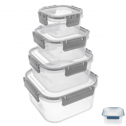 Sada plastových čtvercových dóz o objemech 0,4/0,9/1,8/2,9 l je ideální pro skladování různých druhů potravin. Každá dóza je vybavena víkem se silikonovým těsněním, které zajišťuje lepší uchovávání čerstvosti, a praktickými klipsy pro pevné a bezpečné uzavření. Díky chytrému řešení lze všechny menší dózy vložit do té největší, což výrazně šetří místo při uskladnění. Dózy jsou vhodné pro použití v teplotním rozmezí od -25 do +95 °C, takže je lze používat jak v mrazničce, tak i pro ohřev (bez víka) v mikrovlnné troubě. Jsou také vhodné pro mytí v myčce, což usnadňuje jejich údržbu. Různorodé velikosti usnadňují přehledné a praktické uchovávání surovin i hotových pokrmů. Materiál: plast PP + silikonové těsnění + klipsy PP. Neobsahuje BPA. Rozměry: 21,5x21,5x10 cm, 18,5x18,5x8,5 cm, 15x15x7,5 cm, 12x12x6 cm.