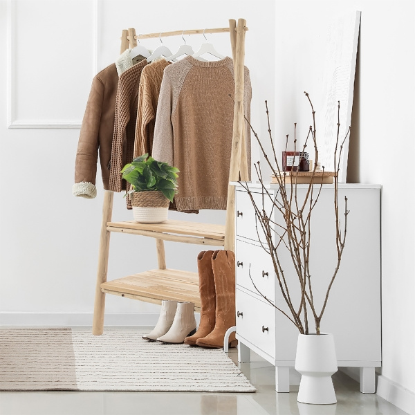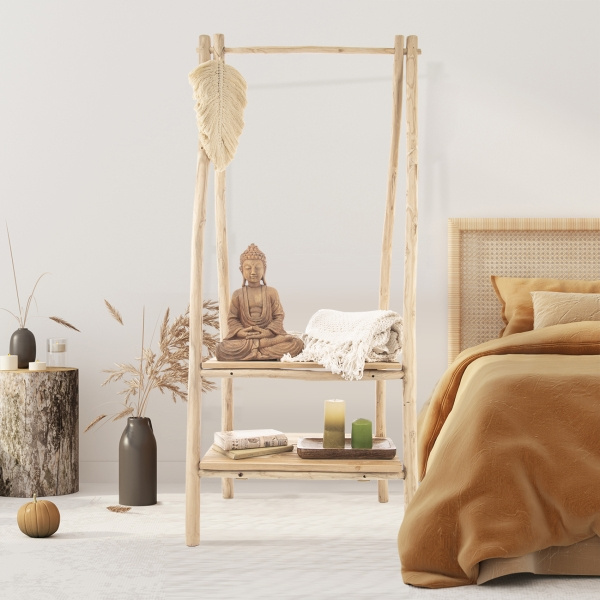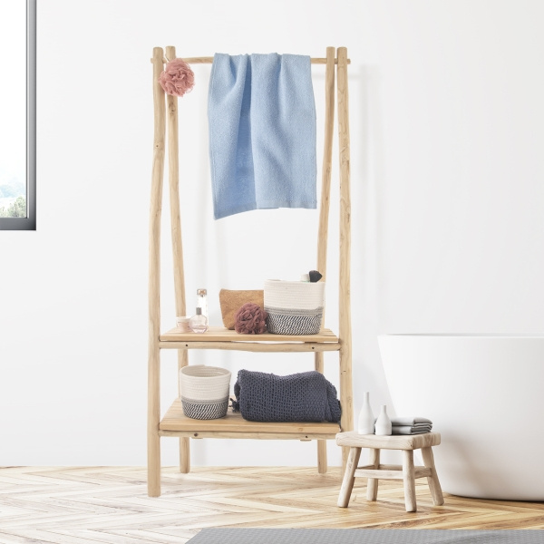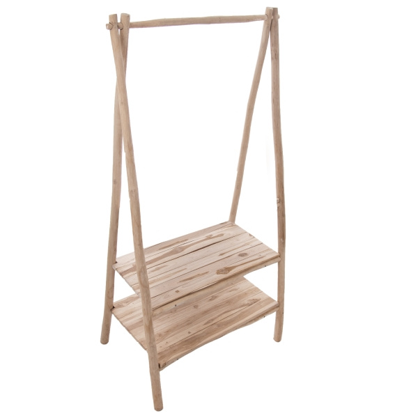 Dřevěný stojan se 2 policemi skvěle využijete jako dekoraci, místo němého sluhy, jako část nábytku a to doma, na terase, balkóně, v koupelně. Materiál: borovicové dřevo. Rozměry: cca 71x50x158 cm. Součástí návod na sestavení a spojovací materiál.