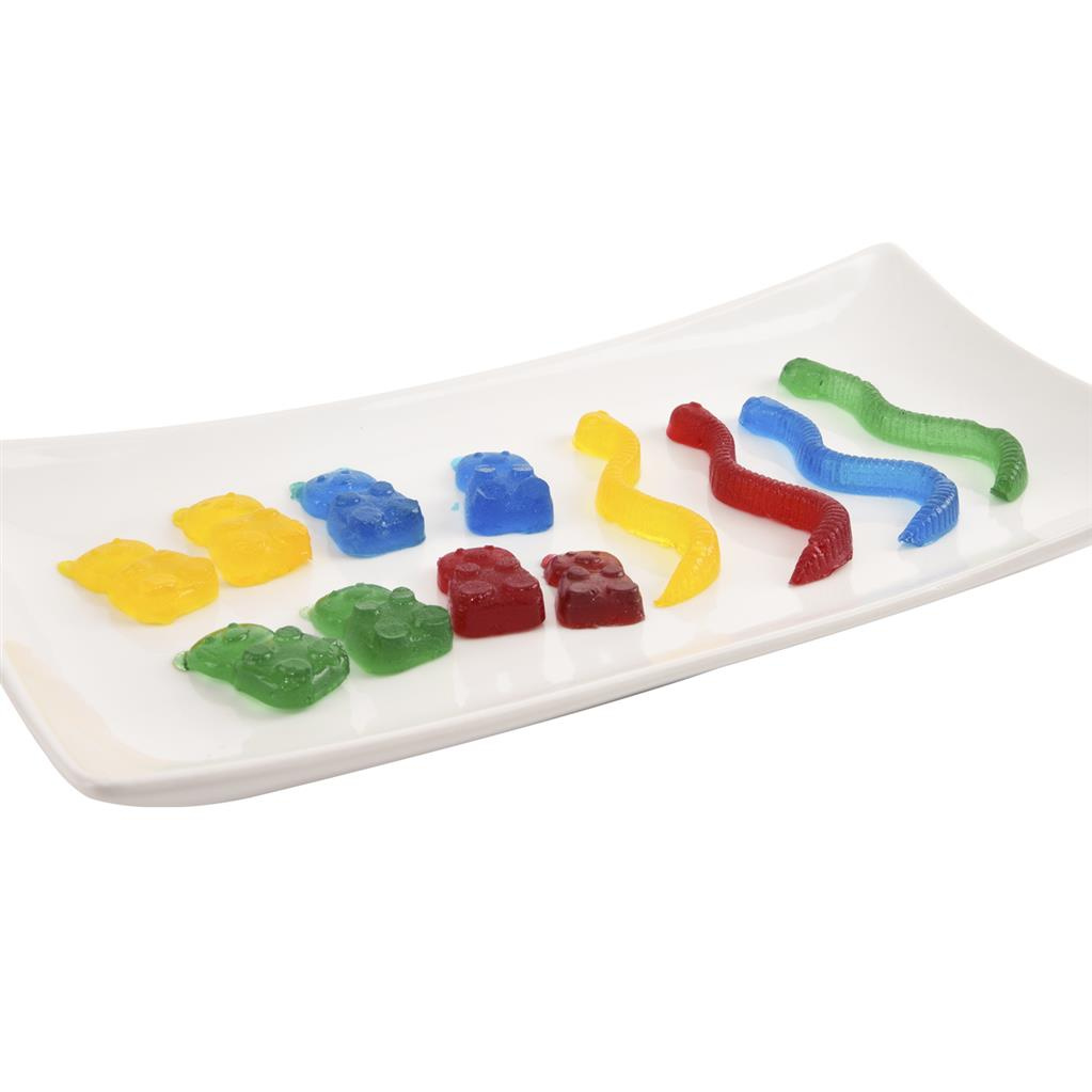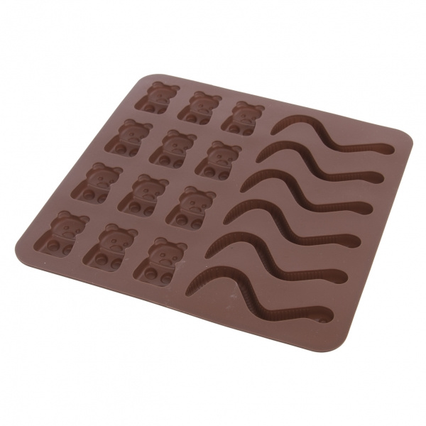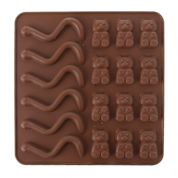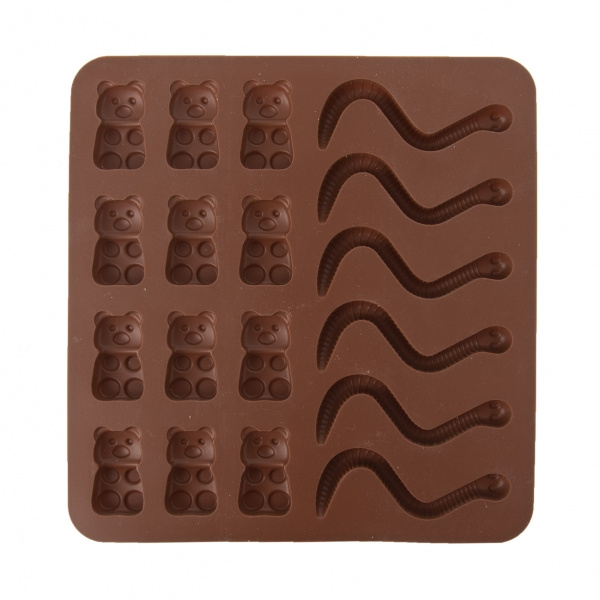 Silikonová forma Vám velmi jednoduše vytvoří želatinové medvídky a žížalky. Výborné domácí cukrovinky ocení především děti. Můžete vyzkoušet různé příchutě a barvy želatiny. Hnědá. Materiál: silikon. Snáší vysoké teploty (od -40 °C do +220 °C), nepřejímá chutě ani vůně z použitých potravin. Vhodná do myčky na nádobí. Rozměry: 19x19x1 cm, medvídek 3,5x2 cm, žížala d. 8 cm.