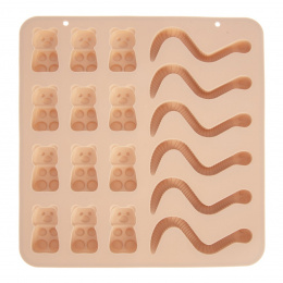 Silikonová forma Vám velmi jednoduše vytvoří želatinové medvídky a žížalky. Výborné domácí cukrovinky ocení především děti. Můžete vyzkoušet různé příchutě a barvy želatiny. Materiál: silikon. Snáší vysoké teploty (od -40 °C do +220 °C), nepřejímá chutě ani vůně z použitých potravin. Vhodná do myčky na nádobí, mrazáku, trouby a MVT. Rozměry: 19x19x1 cm, medvídek 3,5x2 cm, žížala d. 8 cm.