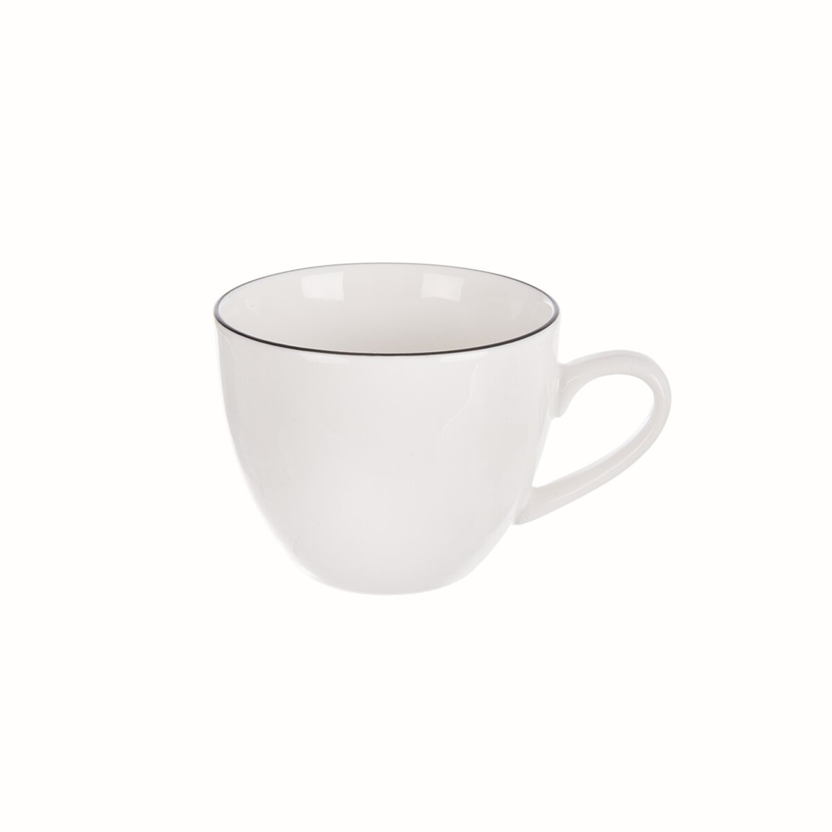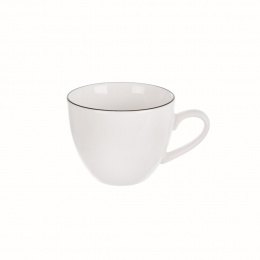 Elegantní porcelánový hrnek má hladký bílý povrch a je zdoben jemnou černou linkou po okraji, která podtrhuje jeho vytříbený vzhled. Ideální na espresso – stylový doplněk pro každého milovníka kávy. Materiál: New Bone China – velmi kvalitní, pevný a odolnější než běžný porcelán. Rozměry: pr. 6,5 cm, v. 5,2 cm, o. 100 ml. Můžete jej doplnit podšálkem 129174 z naší nabídky. Lze mýt v myčce a použít v MVT.