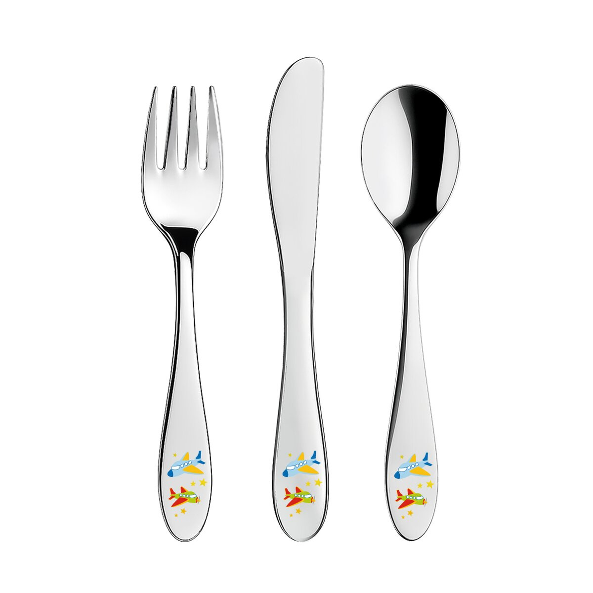 Dětský příbor s barevným dekorem letadel pro kluky. Obsahuje 3 ks - lžíci, vidličku a nůž. Materiál: kvalitní nerez. Tvar přizpůsobený dětem. Lze mýt v myčce na nádobí, ale nedoporučujeme, mohlo by dojít k porušení barevného dekoru, což později nemůže být důvodem reklamace. Rozměry: (délka/šířka) lžíce 15,5/3,5 cm, vidlička 15,5/2,5 cm, nůž 17/2 cm.