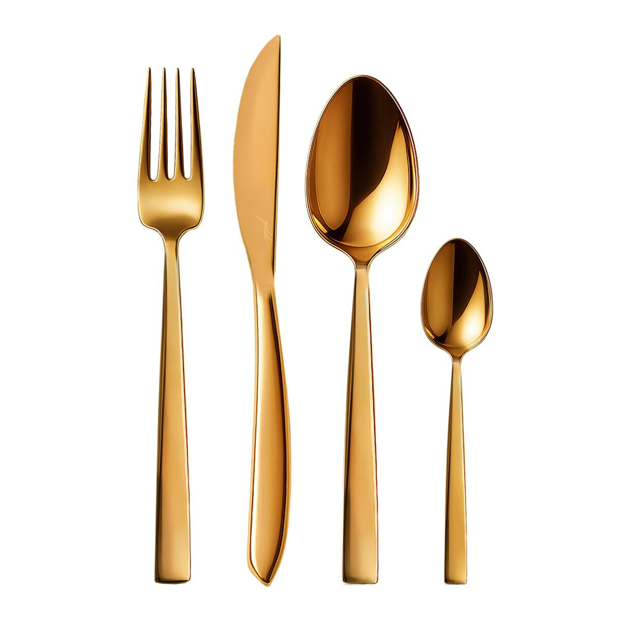 Sada luxusních nerezových příborů ve zlaté barvě GOLD v dárkovém balení. Sada 24 ks. Moderní jednoduchý tvar, atraktivní zlatý lesklý povrch. Materiál: kvalitní nerezová ocel, povrch úprava PVD – zlatý, který je vysoce odolný a zaručuje tak dlouhou životnost příborů. Příbory lze mýt v myčce na nádobí, ale pokud chcete zachovat neporušený povrch, pak to vzhledem k působení čisticích prostředků nedoporučujeme. Rozměry: 6x lžička – d. 14 cm, 6x lžíce – d. 21 cm, 6x vidlička – d. 21 cm a 6x nůž – d. 24 cm.