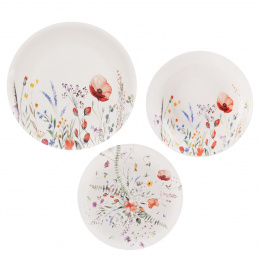 Sada kulatých talířů s dekorem MÁK obsahuje 18 dílů. Materiál: porcelán. Rozměry: dezertní pr. 20,5 cm, v. 2 cm, hluboký pr. 20,5 cm, v. 4 cm, mělký pr. 27,3 cm, v. 2,5 cm. Lze mýt v myčce a použít v MVT.