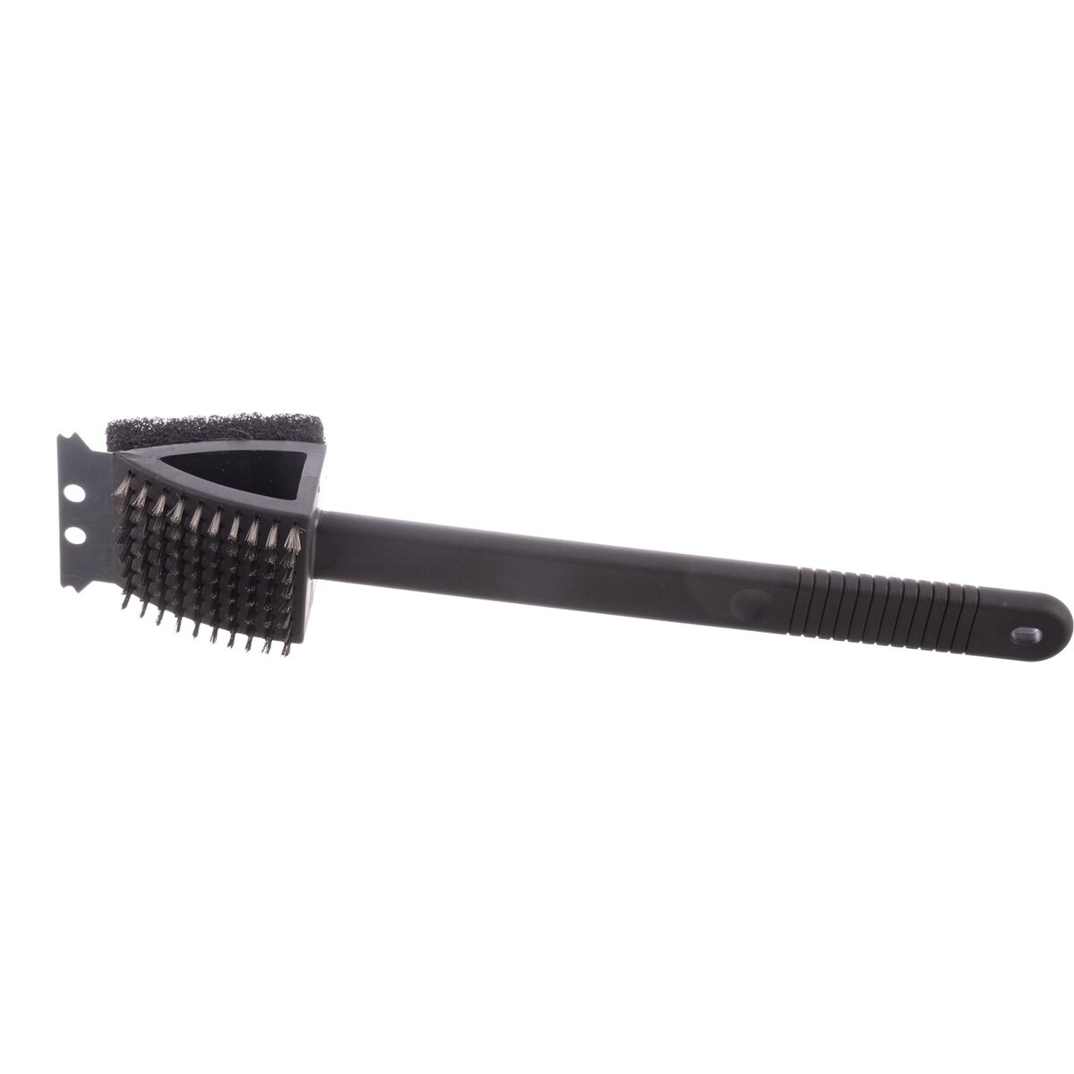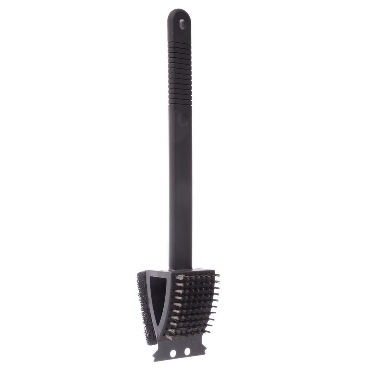 Praktický kartáč na údržbu grilu a grilovací mřížky kombinuje tři účinné nástroje v jednom. Klasický drátěný kartáč z nerezové oceli, odolný proti korozi a vysokým teplotám, je ideální pro hrubé čištění připálenin. Nerezová škrabka s plochou špičkou snadno odstraní silně připečenou mastnotu a jiné nánosy. Čisticí houba z polyesterového vlákna je určena pro jemné dočištění, není vhodná pro přímý kontakt s žhavým grilem. Tento multifunkční nástroj šetří čas i místo, nemusíte pořizovat a střídat různé čisticí pomůcky. Je však třeba se vyhnout používání na grilovacích kamenech, včetně lávových, aby nedošlo k jejich poškození. Možnost zavěšení. Materiál: plast PP (rukojeť), nerezová ocel (škrabka, kartáč), PES (houba). Rozměry: celková d. 38 cm, plocha kartáče 5,5x6,5 cm, plocha houby 6x8 cm, škrabka š. 7 cm.