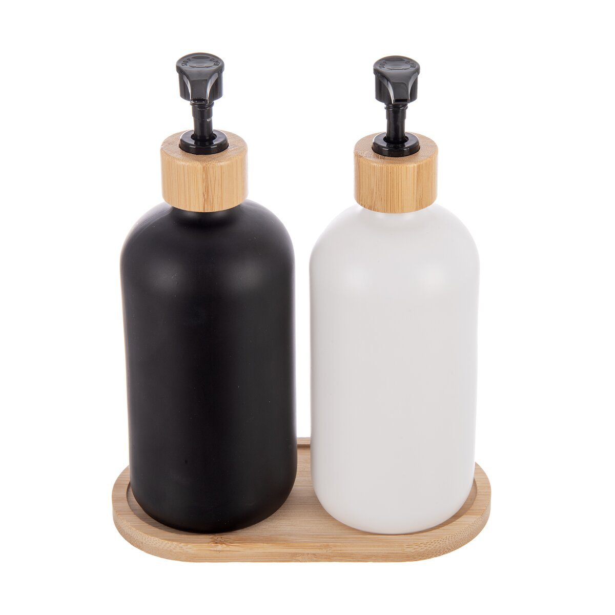Koupelnová sada dvou dávkovačů na stylovém bambusovém tácku oživí každou koupelnu i kuchyni. Její moderní a zároveň přírodní vzhled působí velmi elegantně a vkusně zapadne do různých interiérů. Dávkovače si navíc můžete libovolně označit pomocí našich nálepek, což zajistí přehlednost a praktičnost při každodenním používání. Tato sada je ideální kombinací estetiky a funkčnosti. Materiál: sklo, bambus (tácek), plast PP (pumpička). Rozměry: 17,5x9x22 cm, dávkovač pr. 7,5 cm, v. 21 cm, o. 500 ml.