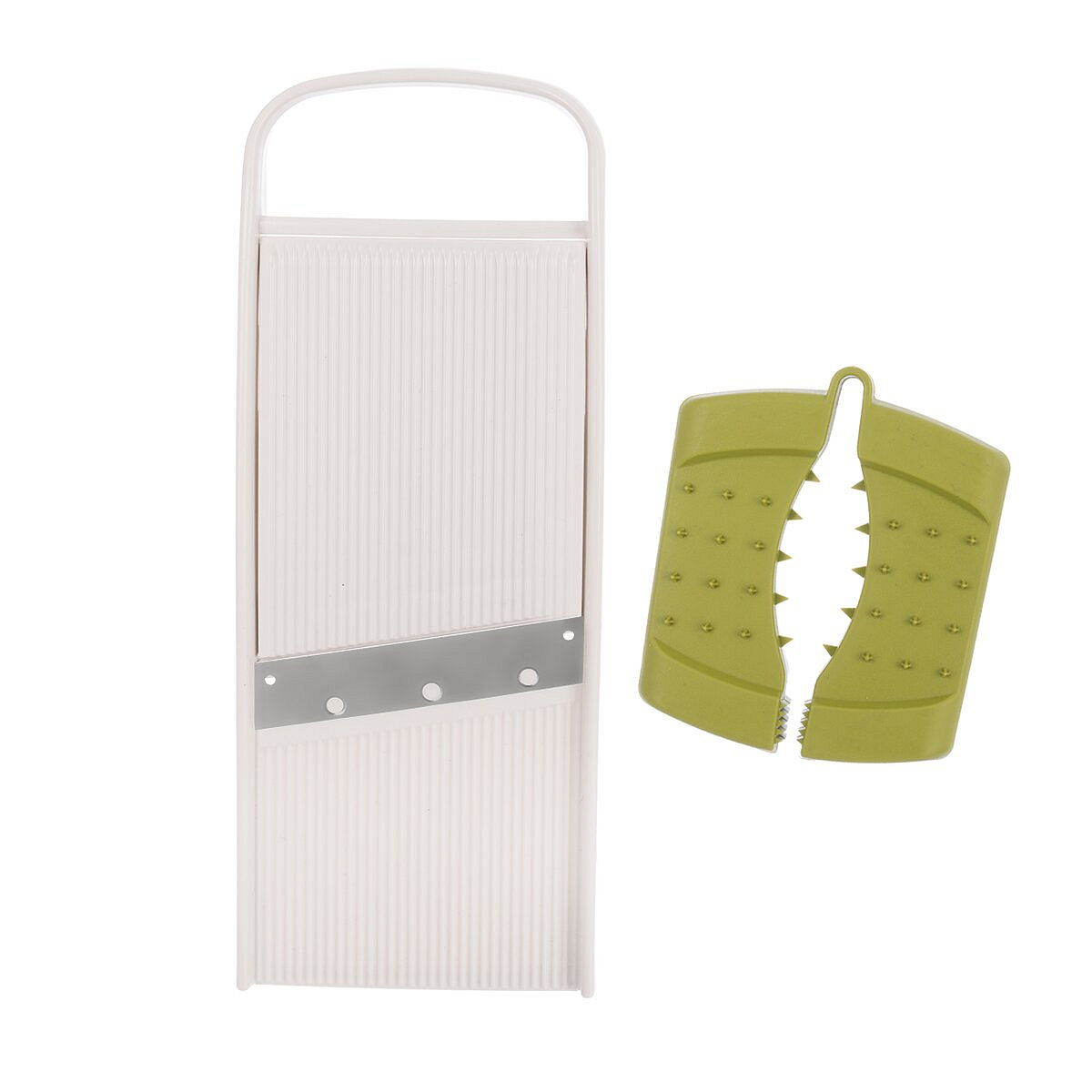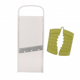 Kráječ-struhadlo s vodicím držákem je praktickým pomocníkem pro rychlé a bezpečné krájení a strouhání potravin. Umožňuje nastavení tloušťky plátků ve třech stupních – 3, 5 a 7 mm – podle potřeby a typu suroviny. Kráječ je vybaven držákem proti poranění se speciálními hroty, které zajišťují pevné uchycení potravin během práce a umožňují bezpečnou manipulaci i s malými surovinami, například česnekem. Pro větší stabilitu při použití obsahuje kráječ dva protiskluzové rohy, které zabraňují nežádoucímu posunu kráječe během krájení či strouhání, a zajišťují tak pohodlnou a bezpečnou práci v kuchyni. Výrobek je BPA-free. Materiál: plast ABS + plast PP (držák) + nerezová ocel 301 + EVA (anti slip rohy). Rozměry: 28x10,5x4 cm. Lze mýt v myčce.