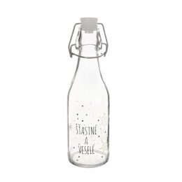 Láhev s dekorem na slivovičku, vaječný likér, sirup, šťávu a jiné nápoje. S pákovým uzávěrem s těsněním. Bude se vám hodit, pokud chcete jako dárek věnovat například domácí vaječný koňak, punč, sirup. Na závěsnou kartičku můžete vepsat věnování nebo popis o jaký lahodný mok se jedná a kdy byl vyroben. Materiál: sklo, kovová přezka, plast, silikonové těsnění. Rozměry: objem 0,52 l, pr. 7 cm, v. 26,5 cm.