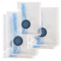 Sada 5 odsávacích vaků je vhodná pro uskladnění sezónních oděvů, lůžkovin, textilních i plyšových hraček. Po odsátí vzduchu z vaku pomocí vysavače nebo pumpičky na odsávání vaku se objem vaku výrazně zmenší a Vy ušetříte místo na ukládání. Oděvy zároveň chráníte před roztoči, moly i prachem. Materiál: plast (PA+PE). Rozměry: 1 ks 70x50 cm, 2 ks 90x55 cm, 2 ks 130x80 cm.