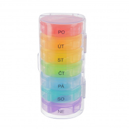 Dělený organizér na léky s CZ popisky na 7 dní je rozdělen na jednotlivé dny a ty pak na ranní a večerní dávku léků. Na každý den je samostatná krabička, kterou si můžete pohodlně vzít kamkoli s sebou. Do každé přihrádky si můžete připravit dávku léků na ráno a večer v daný den v týdnu. Každá přihrádka je opatřena průhledným zavíracím víčkem a označením částí daného dne. Materiál: plast PP a ABS (obal). Rozměry: organizér 14x6,5x6,5 cm, jednotlivá krabička na každý den pr. 6 cm, v. 1,7 cm, jednotlivá část 5,7x2,5x1,5 cm.