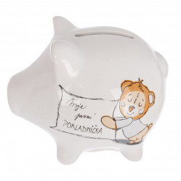 Bílá keramická pokladnička ve tvaru prasátka s nápisem „Moje první pokladnička“ je ideálním místem pro uchování prvních úspor vašeho dítěte a připomínkou jeho prvních krůčků k samostatnosti. Každá vložená korunka tak získává svůj vlastní příběh. Díky jemnému designu a kvalitnímu keramickému provedení se pokladnička stává nejen praktickým, ale i krásným dárkem vhodným k narození dítěte, křtinám nebo narozeninám. Zespodu je opatřena praktickou zátkou pro snadné vyjmutí úspor. Materiál: keramika. Rozměry: 20,5x15,5x16 cm. Designed by Orion.