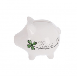 Bílá keramická pokladnička ve tvaru prasátka s nápisem „Pro štěstí“ je praktickým a zároveň stylovým doplňkem, který vám poslouží jako malý talisman a motivace k šetření na sny, jež stojí za to. I když štěstí si koupit nelze, můžete si na něj postupně našetřit! Díky jednoduchému a čistému designu se pokladnička hodí do každého interiéru a zároveň je ideálním dárkem pro každého, kdo si zaslouží kousek štěstí navíc. Zespodu je opatřena praktickou zátkou pro snadné vyjmutí úspor. Materiál: keramika. Rozměry: 11x9x9 cm. Designed by Orion.