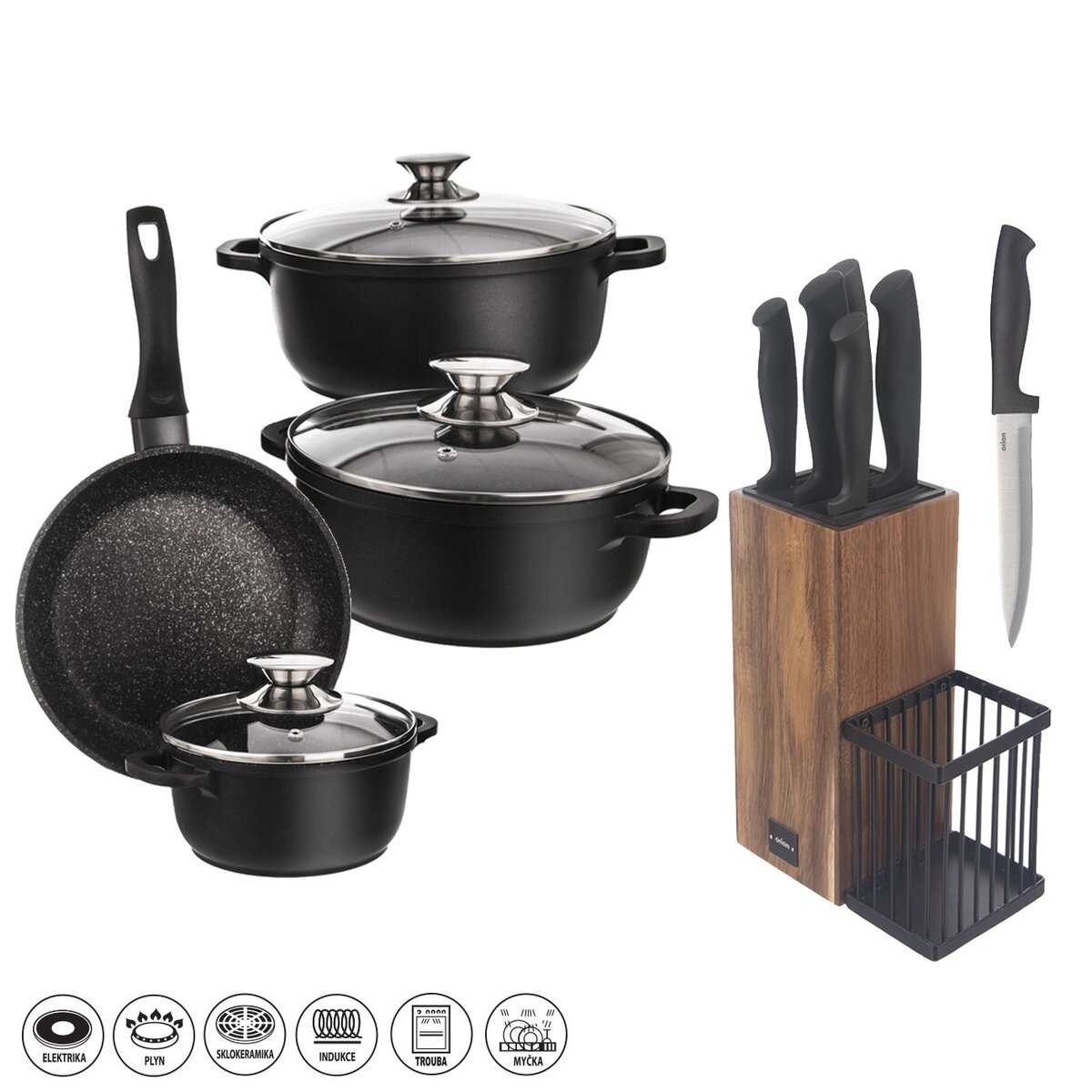 Sada nádobí – masivní hrnce s poklicí a pánev s velmi kvalitním nepřilnavým povrchem PFLUON GRANIT. Můžete v něm vařit, smažit, dusit, opékat a zapékat s minimální potřebou tuku. Připravovaný pokrm se nepřipéká. Poklice s otvorem pro únik přebytečné páry. Vhodné na všechny typy spotřebičů včetně indukce i trouby (krom pánve). Materiál: hliník s vynikajícím nepřilnavým povrchem PFLUON GRANIT a s profilovaným dnem, sklo, nerez, plast. Rozměry: hrnec pr. 16 cm, v. 8/13 cm, o. 1,4 l, hrnec pr. 20 cm, v. 8,5/13,5 cm, o. 2,4 l, hrnec pr. 24 cm, v. 10,5/16 cm, o. 4,2 l, pánev pr. 24 cm, v. 5 cm. Doporučujeme použití kuchyňské chňapky. U plynových sporáků volte správnou velikost plamene, u elektrických, sklokeramických a indukčních vařičů je nutné zvolit odpovídající velikost ploténky. Připravovaný pokrm lze na sporáku připravit a pak jej vložit do trouby (krom pánve). Připravené jídlo můžete pohodlně skladovat v hrncích také v chladničce. Při použití v troubě poklice max. do 200 °C. Lze mýt v myčce na nádobí. K tomu stojan na nože a kuchyňské náčiní je velmi elegantní a má nadčasový design. Je doplněn 5 noži různé velikosti, které umístíte do gumového vkladu v dřevěné části stojanu. Další kuchyňské náčiní (nůžky, brousek, vařečku...) je možné uložit do kovového postranního košíku. Vše máte po ruce a nože se netupí nikde v zásuvkách. Vypadá velmi stylově, uplatní se jak v moderní, tak klasické kuchyni. Snadná údržba. Materiál: akáciové dřevo, plast, kov – košík, nerezová ocel – čepel nožů, plast – rukojeť nožů. Rozměry: stojan 16x9x22,5 cm, nože (čepel/celková délka) 7,5/18 cm, 12,5/23 cm, 14,5/27 cm, 20/32 cm, se zubatým ostřím 17,5/30 cm. Stojan není vhodný do myčky, nože jsou vhodné do myčky. Po umytí v myčce dobře vysušte. Častým používáním myčky dochází k postupnému tupení ostří.