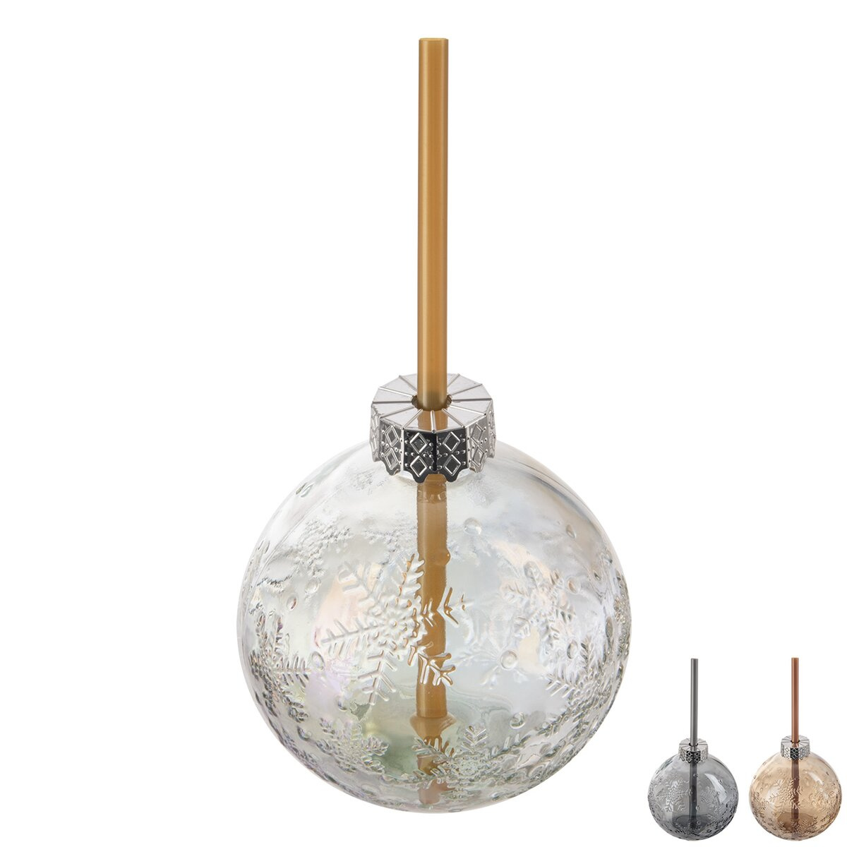 Tvarovaná sklenice s brčkem ve tvaru vánoční baňky je skvělá na zimní oslavy, večírky a posezení s příteli. Hodí se pro servírování různých nápojů s alkoholem i bez něj. Je zdobena protlačovaným dekorem vloček. Mix barev. Materiál: sklo, plast ABS (víčko a brčko). Rozměry: užitný o. 220 ml, celkový o. 420 ml, pr. 10 cm, v. 10 cm, d. brčka 19 cm pr. otvoru 2 cm. Není vhodná do myčky ani do MVT.