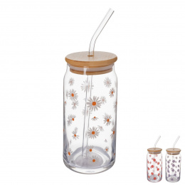 Dopřejte si chvíle pohody s elegantní sklenicí zdobenou drobnými kvítky z borosilikátového skla. Tento kousek přináší svěžest a radost do každodenního stolování. Díky víčku s těsněním se nemusíte bát vylití (je nutné pořádně víčko zatlačit). Víčko umožňuje přímé pití pomocí přiloženého skleněného brčka, nebo lze sklenici používat samostatně bez víčka a brčka. Skvěle se hodí pro domácí limonádu, ovocnou šťávu nebo jakýkoliv jiný oblíbený nápoj. Sklenice je vyrobena z kvalitního odolného skla, díky čemuž je vhodná pro běžné používání. Materiál: borosilikátové sklo, bambus (víčko), silikon (těsnění). Rozměry: pr. 7,5 cm, v. 14,5 cm, d. brčka 21 cm, objem 500 ml. Není vhodná do myčky a mikrovlnné trouby. Mix dekorů.