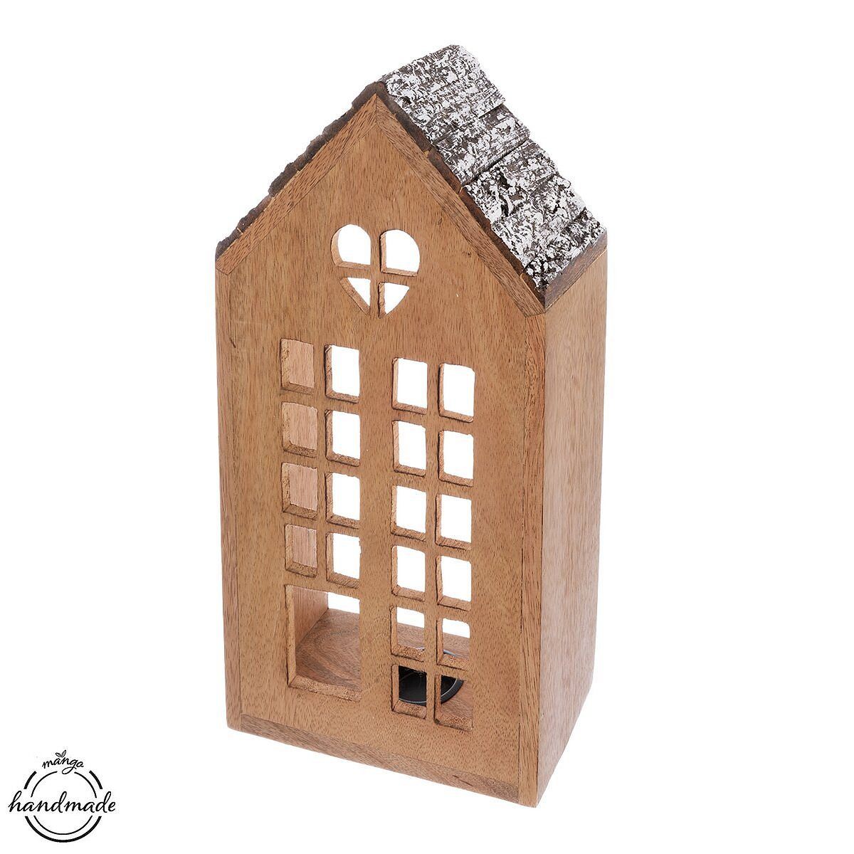 Svícen z mangového dřeva ve tvaru domečku bude krásným a stylovým prvkem interiéru během celého roku. Jeho přírodní materiál a originální design v podobě domečku dodají prostoru útulnou atmosféru. Uprostřed svícnu se nachází stojánek určený pro čajovou svíčku. V případě jejího použití však nenechávejte svícen bez dozoru a vždy dohlédněte na to, aby plamen nesahal příliš vysoko. Pro větší bezpečnost můžete místo klasické svíčky použít i bezpečnou variantu v podobě LED svíčky. Skvěle poslouží jako vkusný a nápaditý dárek. Materiál: mangové dřevo, kov. Rozměry: 19,5x10x38,5 cm.