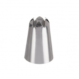 Zdobicí nerezová špička s 6 cípy je určena pro zdobení dortů, zákusků, muffinů, cupcaků a dalších dezertů krémem. Také s ní můžete zdobit jednohubky pomazánkou. Používá se společně s cukrářským sáčkem. Materiál: nerezová ocel. Rozměry: pr. 2/3 cm, v. 4,3 cm. Lze mýt v myčce.