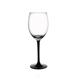 Sklenice na nožce na víno. Materiál: sklo. Nožička z černého skla. Rozměry: objem 0,26 l, pr. 7,2 cm, v. 19,5 cm. Lze mýt v myčce.